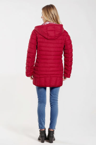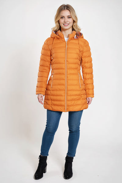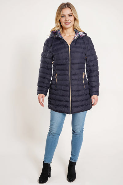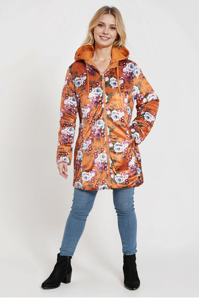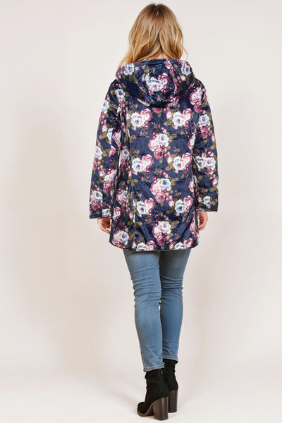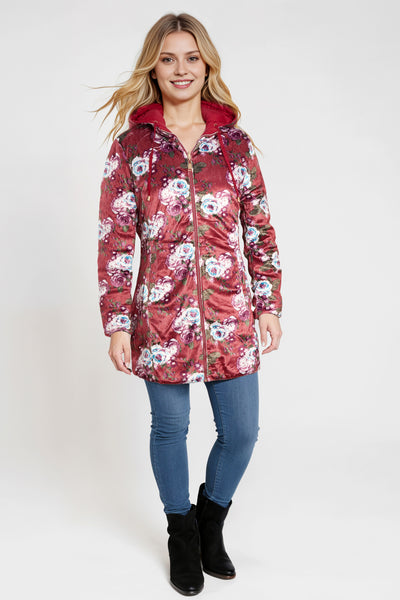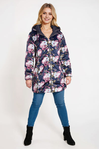 Ladies hooded & reversible quilted jacket with floral velvet lining, zip front to fasten, princess seams to front and back of jacket, zip side entry pockets, machine washable.
